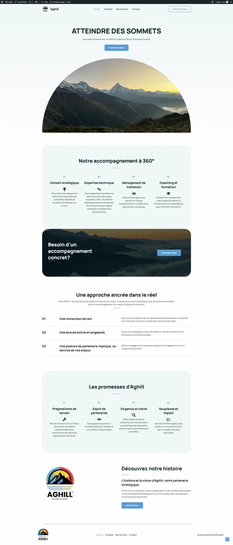 La conception du site a débuté par la réalisation des maquettes UX/UI sur Figma, en privilégiant une arborescence simple, une hiérarchie claire de l’information et une mise en page axée sur la lisibilité. Le développement a ensuite été réalisé avec WordPress, à l’aide du constructeur Elementor, pour garantir un rendu professionnel, responsive et facilement administrable. Le site se compose d’une page d’accueil mettant en valeur les services d’Aghill, d’une section dédiée aux prestations, d’une explication du processus d’accompagnement, ainsi que d’un appel à l’action stratégique facilitant la prise de contact.